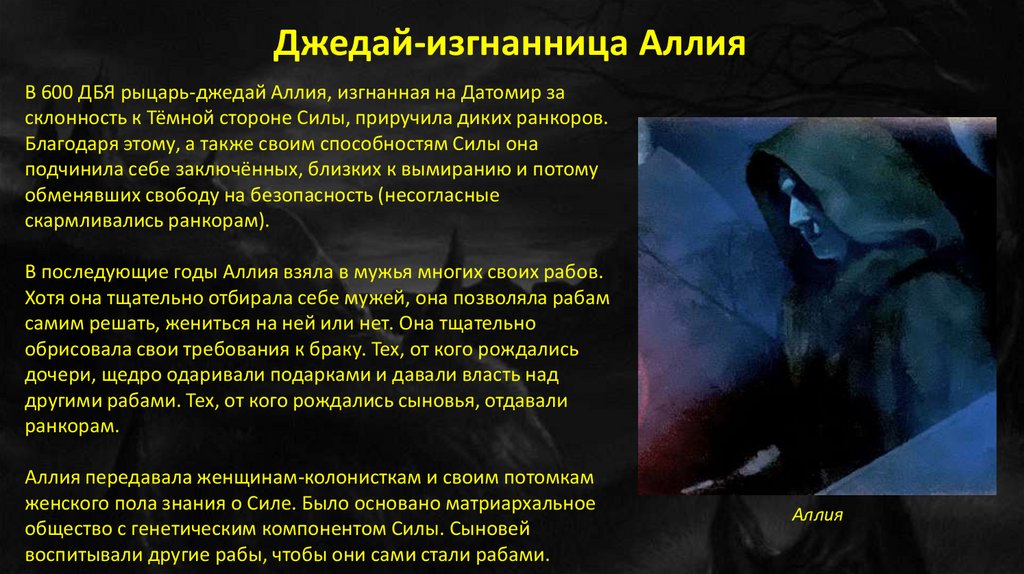 Джедай-изгнанница АллияВ 600 ДБЯ рыцарь-джедай Аллия, изгнанная на Датомир за