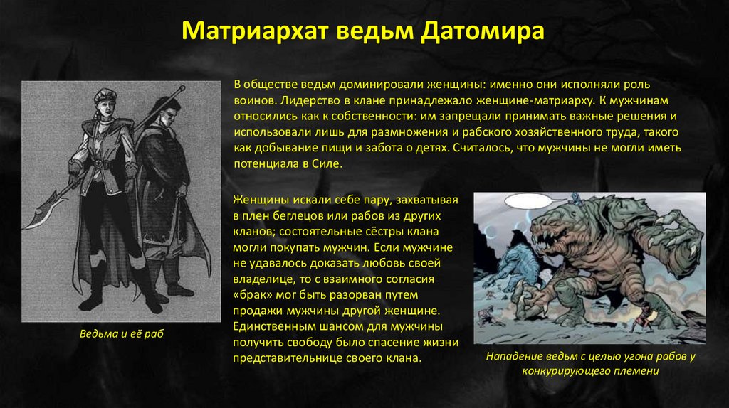Матриархат ведьм ДатомираВ обществе ведьм доминировали женщины: именно они исполняли роль