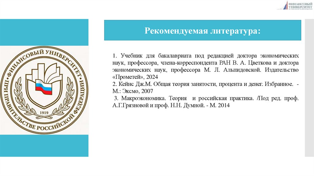 Рекомендуемая литература:1. Учебник для бакалавриата под редакцией доктора экономических