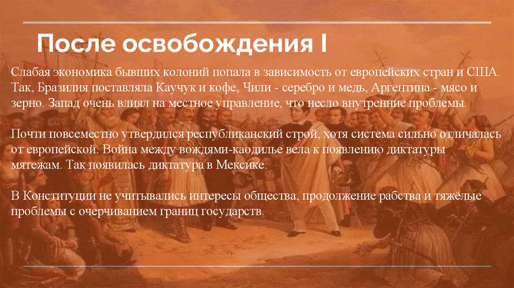 После освобождения IСлабая экономика бывших колоний попала в зависимость от европейских стран и США.