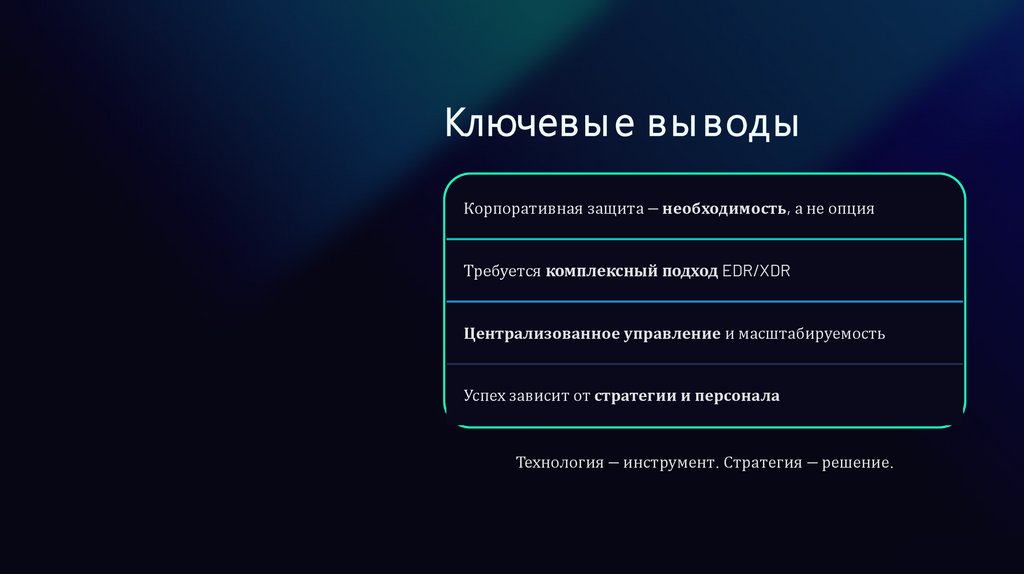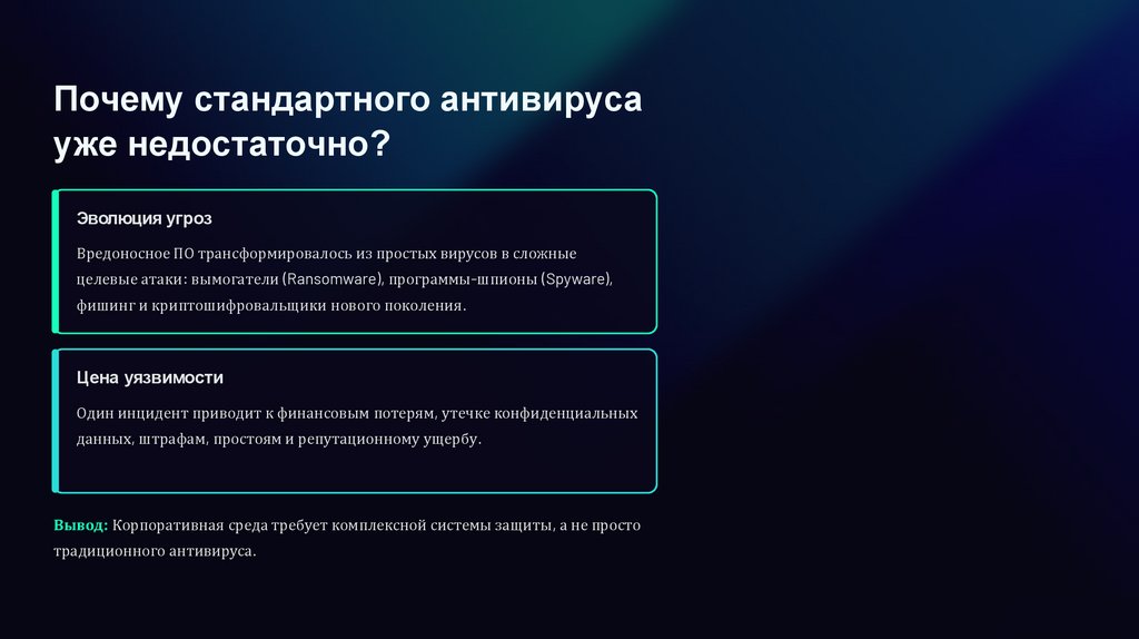 Вывод: Корпоративная среда требует комплексной системы защиты, а не просто