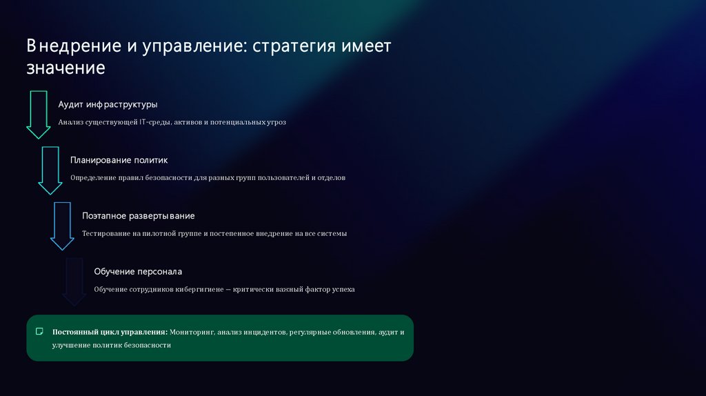 Постоянный цикл управления: Мониторинг, анализ инцидентов, регулярные обновления, аудит и