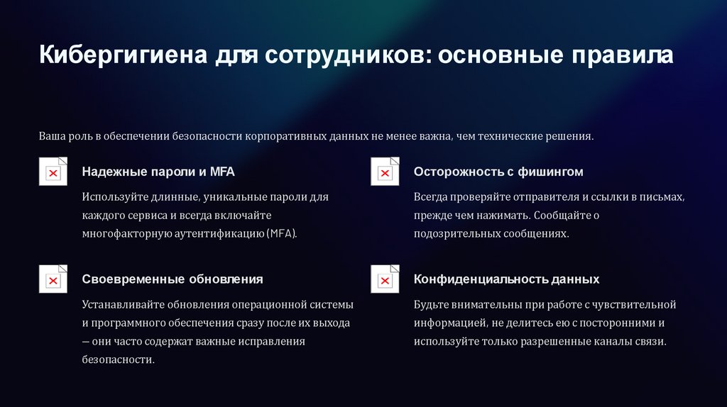 Кибергигиена для сотрудников: основные правилаВаша роль в обеспечении безопасности корпоративных данных не менее важна, чем технические решения.