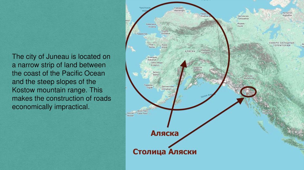 The city of Juneau is located ona narrow strip of land between