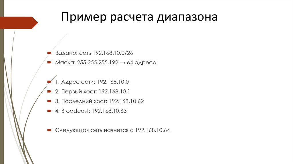Пример расчета диапазонаЗадано: сеть 192.168.10.0/26