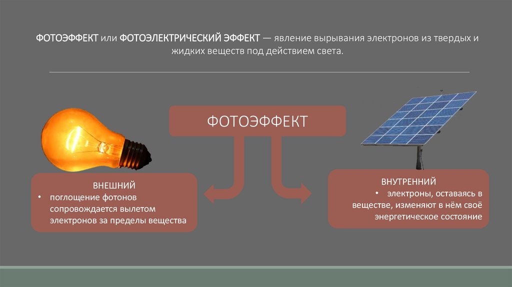 ФОТОЭФФЕКТ или ФОТОЭЛЕКТРИЧЕСКИЙ ЭФФЕКТ — явление вырывания электронов из твердых ижидких веществ под действием света.