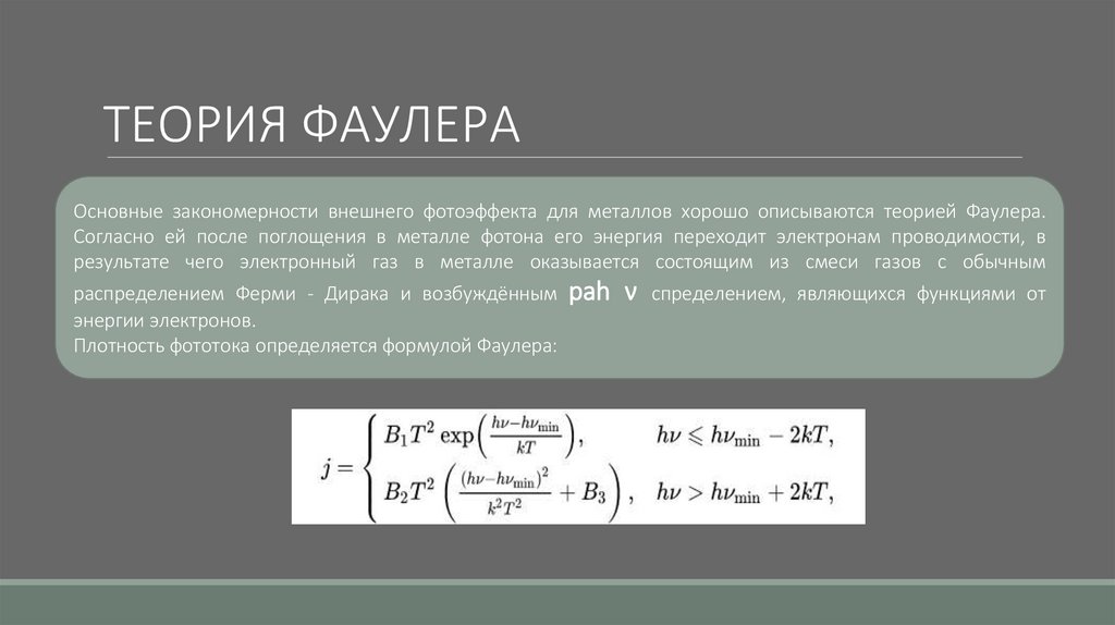 ТЕОРИЯ ФАУЛЕРАОсновные закономерности внешнего фотоэффекта для металлов хорошо описываются теорией Фаулера.