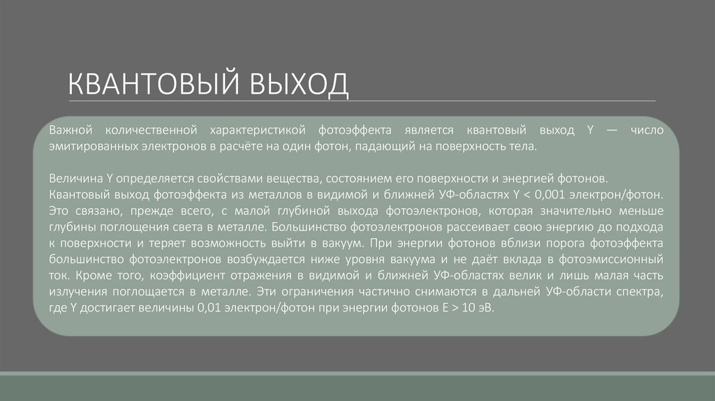 КВАНТОВЫЙ ВЫХОДВажной количественной характеристикой фотоэффекта является квантовый выход Y — число