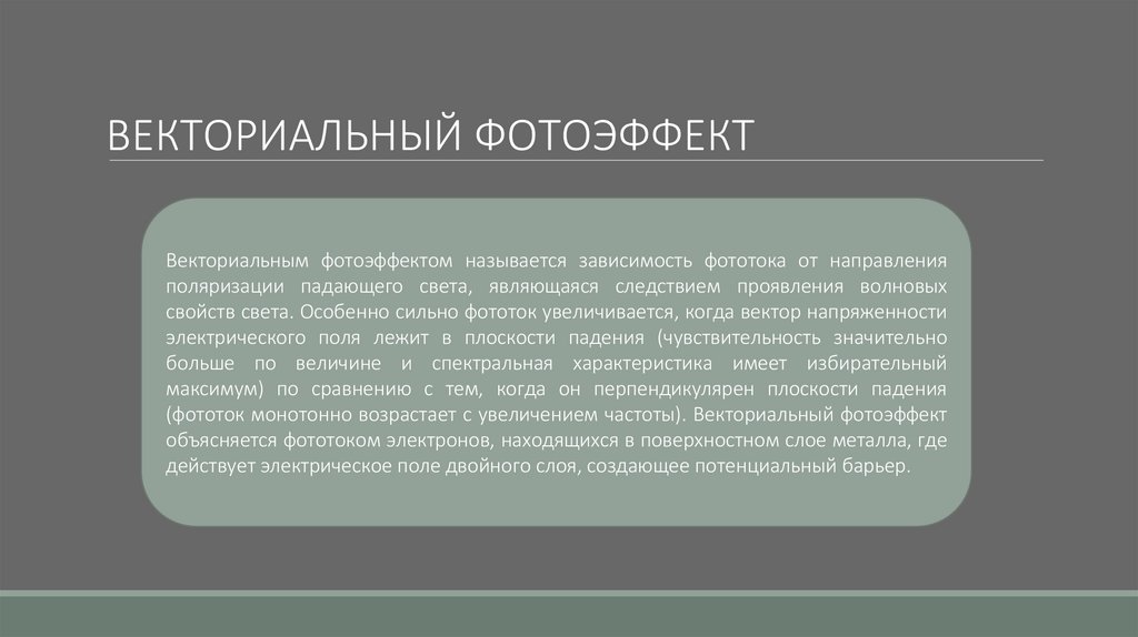 ВЕКТОРИАЛЬНЫЙ ФОТОЭФФЕКТВекториальным фотоэффектом называется зависимость фототока от направления