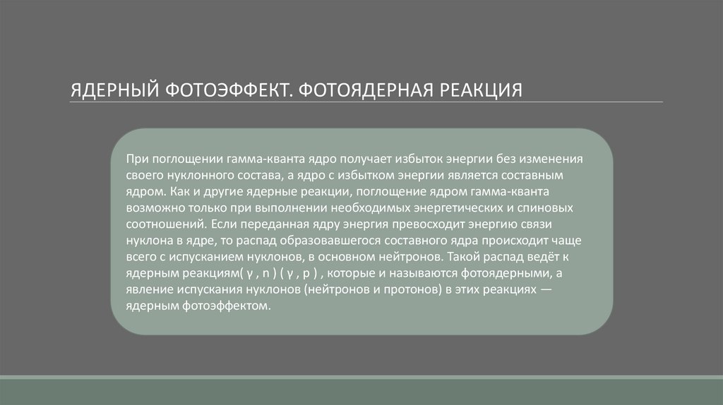 ЯДЕРНЫЙ ФОТОЭФФЕКТ. ФОТОЯДЕРНАЯ РЕАКЦИЯПри поглощении гамма-кванта ядро получает избыток энергии без изменения