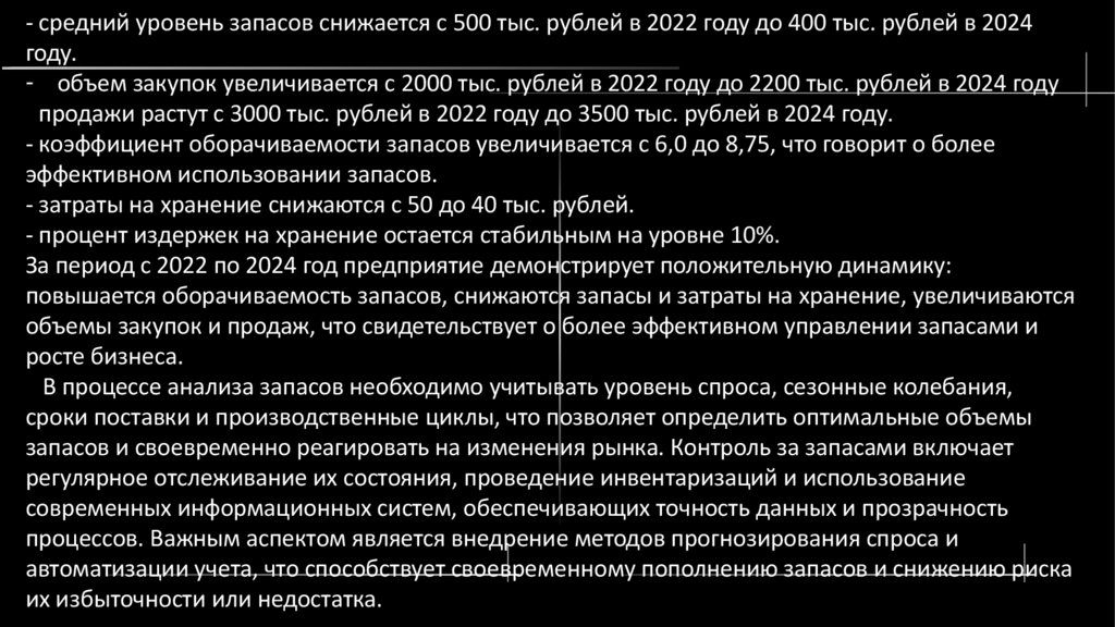 - средний уровень запасов снижается с 500 тыс. рублей в 2022 году до 400 тыс. рублей в 2024году.