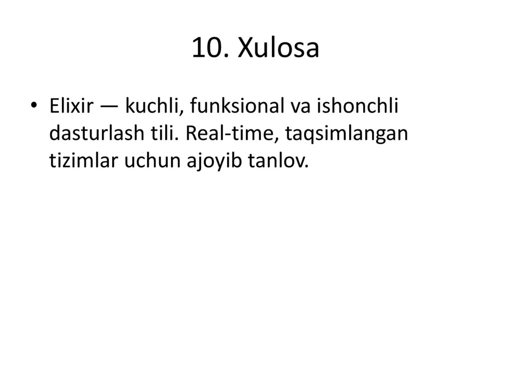 10. Xulosa• Elixir — kuchli, funksional va ishonchli