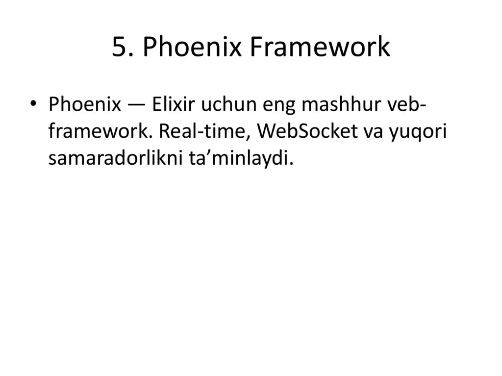 5. Phoenix Framework• Phoenix — Elixir uchun eng mashhur vebframework. Real-time, WebSocket va yuqori