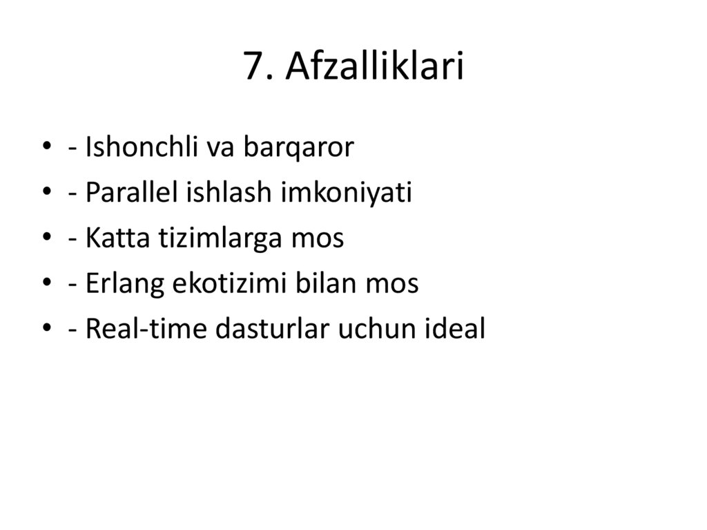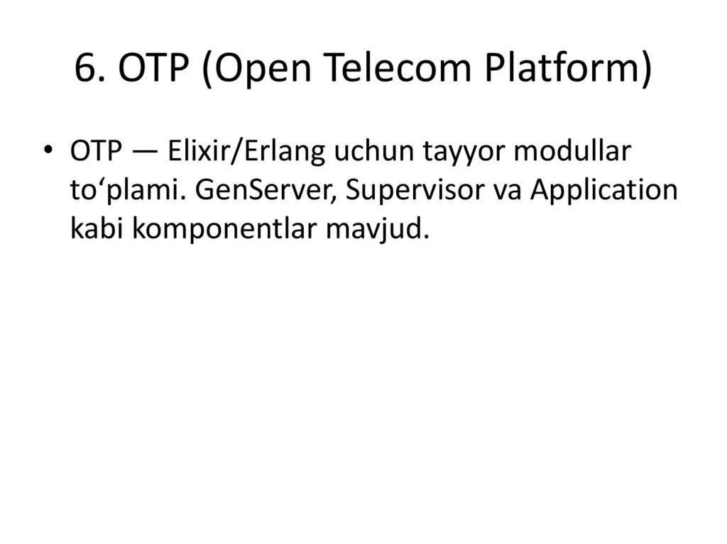 6. OTP (Open Telecom Platform)• OTP — Elixir/Erlang uchun tayyor modullar
