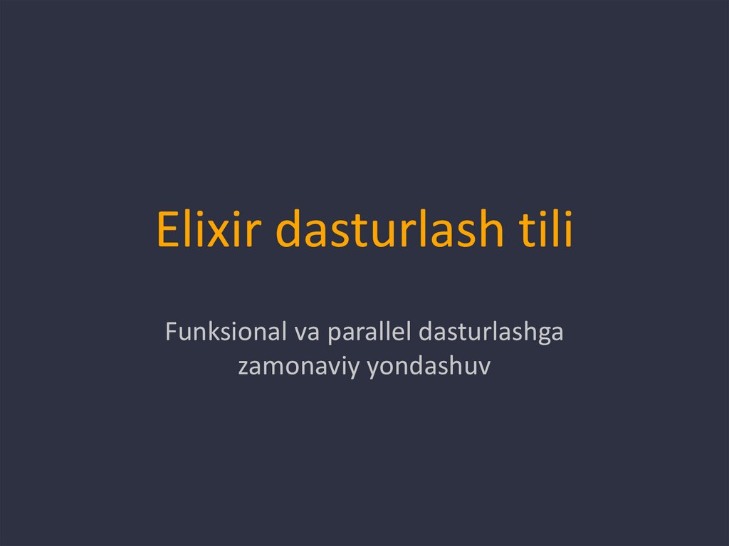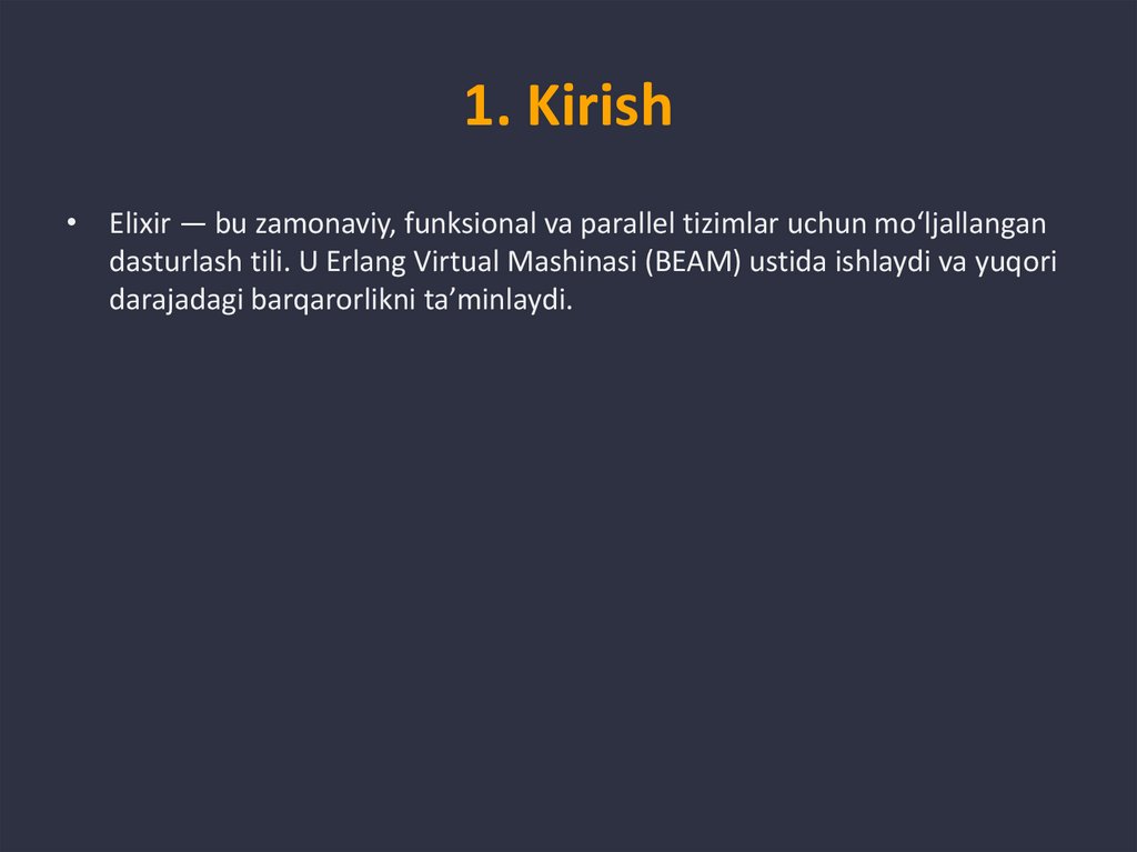 1. Kirish• Elixir — bu zamonaviy, funksional va parallel tizimlar uchun mo‘ljallangan