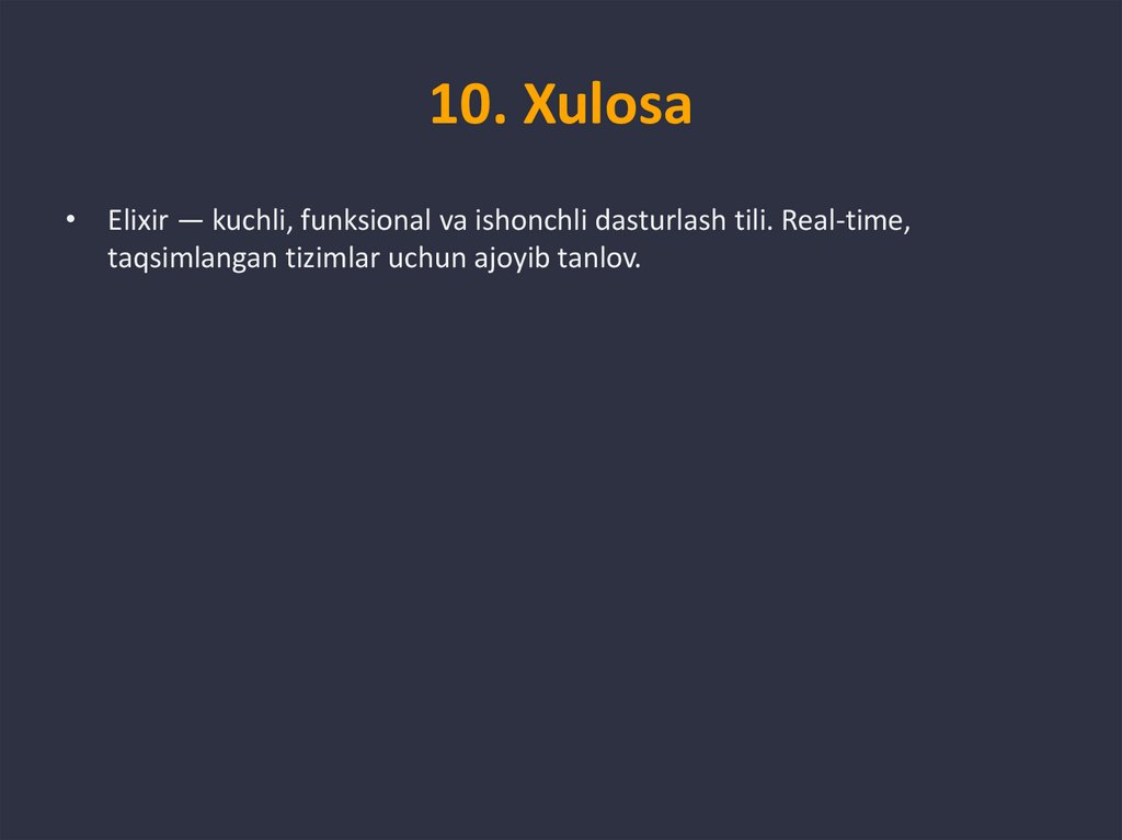 10. Xulosa• Elixir — kuchli, funksional va ishonchli dasturlash tili. Real-time,