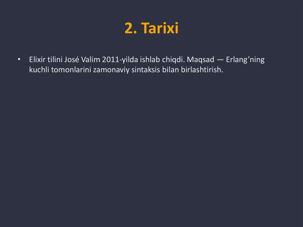 2. Tarixi• Elixir tilini José Valim 2011-yilda ishlab chiqdi. Maqsad — Erlang’ning