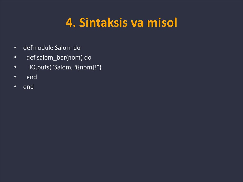 4. Sintaksis va misol• defmodule Salom do