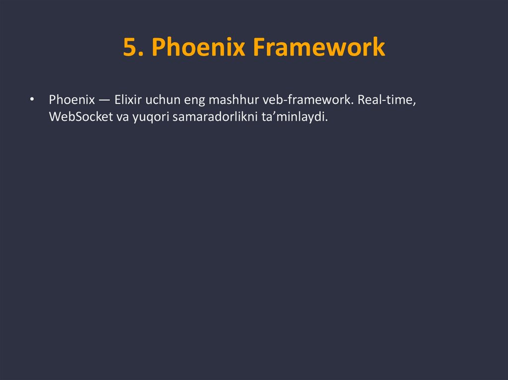 5. Phoenix Framework• Phoenix — Elixir uchun eng mashhur veb-framework. Real-time,