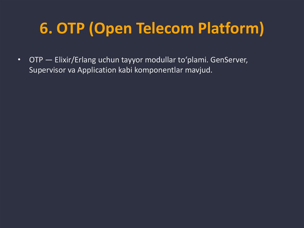6. OTP (Open Telecom Platform)• OTP — Elixir/Erlang uchun tayyor modullar to‘plami. GenServer,