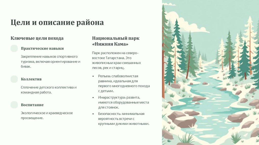 Проект похода: «Вперёд за ветром»Планирование 3-дневного пешего маршрута для школьников в Национальном парке «Нижняя Кама».