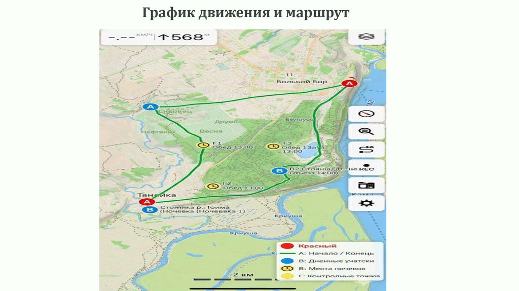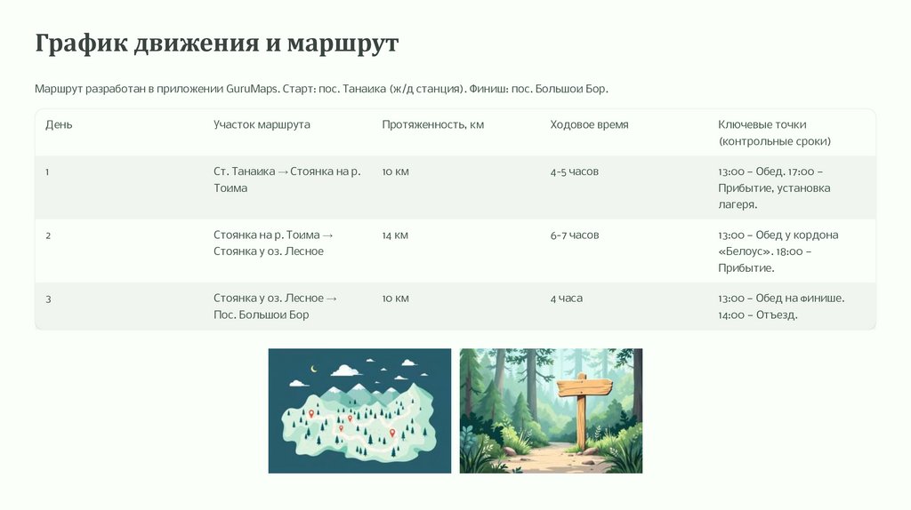 График движения и маршрутМаршрут разработан в приложении GuruMaps. Старт: пос. Танайка (ж/д станция). Финиш: пос. Большой Бор.