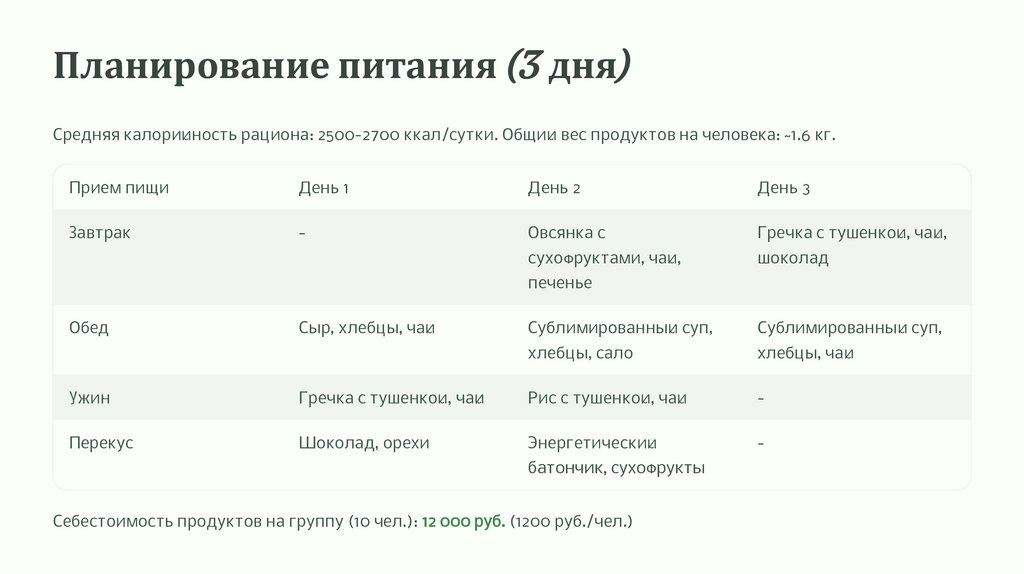 Планирование питания (3 дня)Средняя калорийность рациона: 2500-2700 ккал/сутки. Общий вес продуктов на человека: ~1.6 кг.