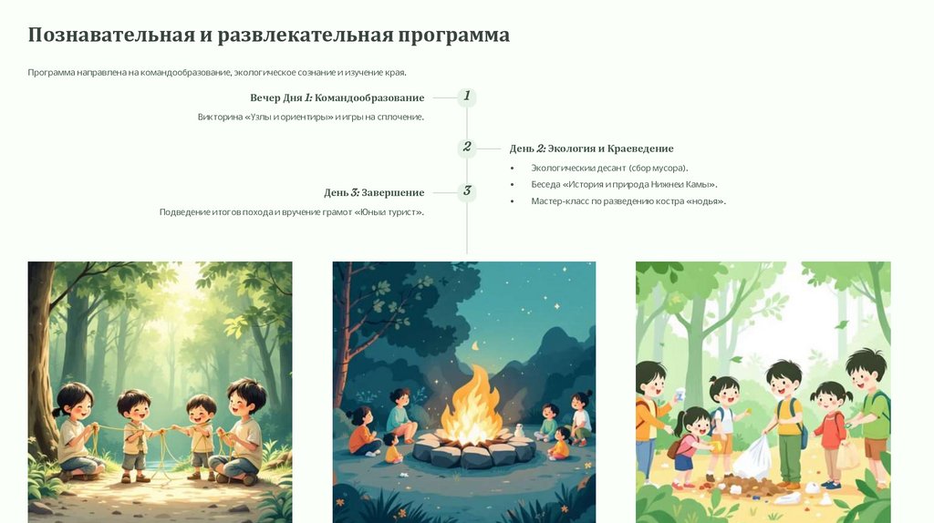 Познавательная и развлекательная программаПрограмма направлена на командообразование, экологическое сознание и изучение края.
