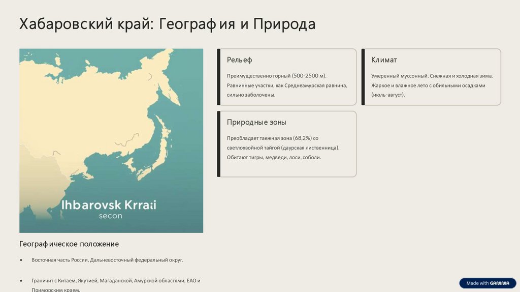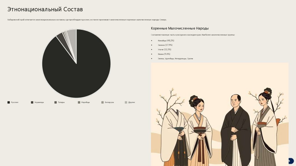 Этнонационал ьный СоставХабаровский край отличается многонациональным составом, где преобладают русские, но также проживают многочисленные коренные малочисленные народы Севера.