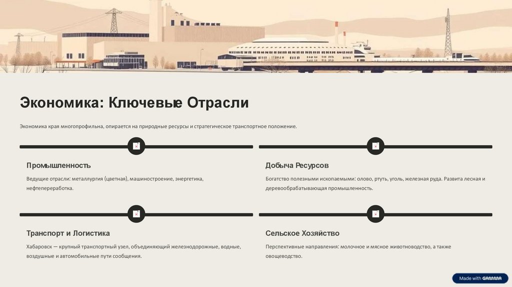 Экономика: Ключевые ОтраслиЭкономика края многопрофильна, опирается на природные ресурсы и стратегическое транспортное положение.