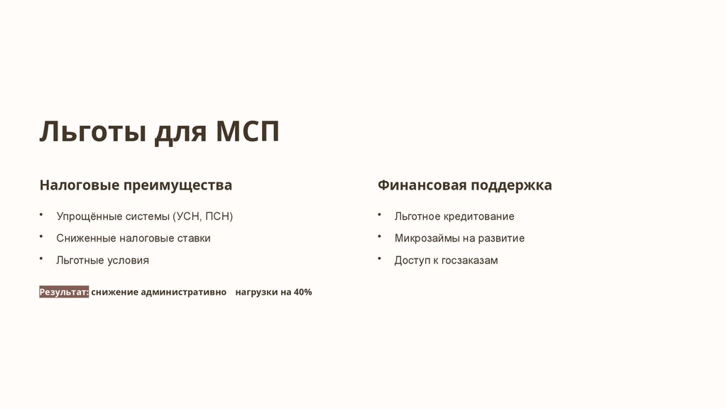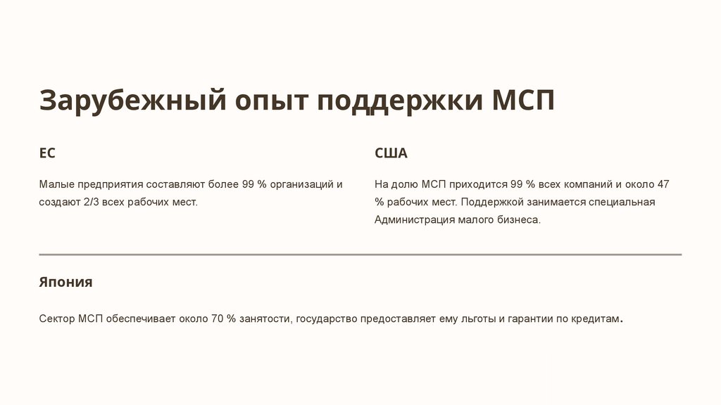 Сектор МСП обеспечивает около 70 % занятости, государство предоставляет ему льготы и гарантии по кредитам.
