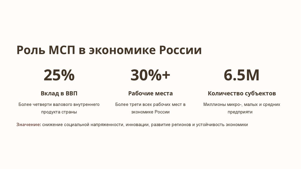 Значение: снижение социальной напряженности, инновации, развитие регионов и устойчивость экономики