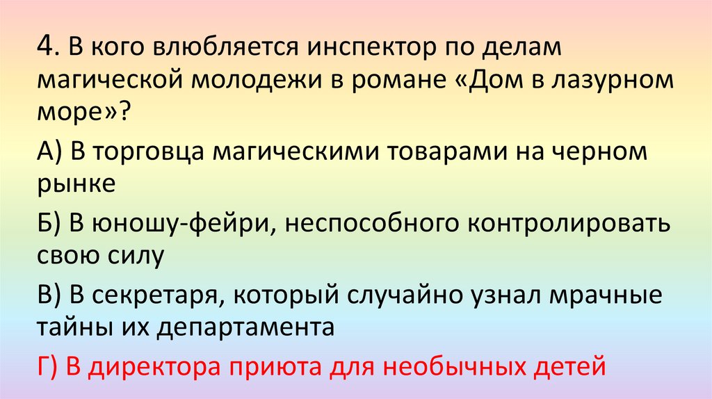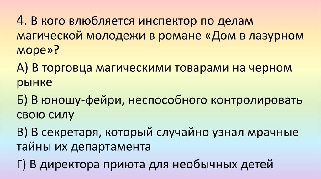 4. В кого влюбляется инспектор по деламмагической молодежи в романе «Дом в лазурном