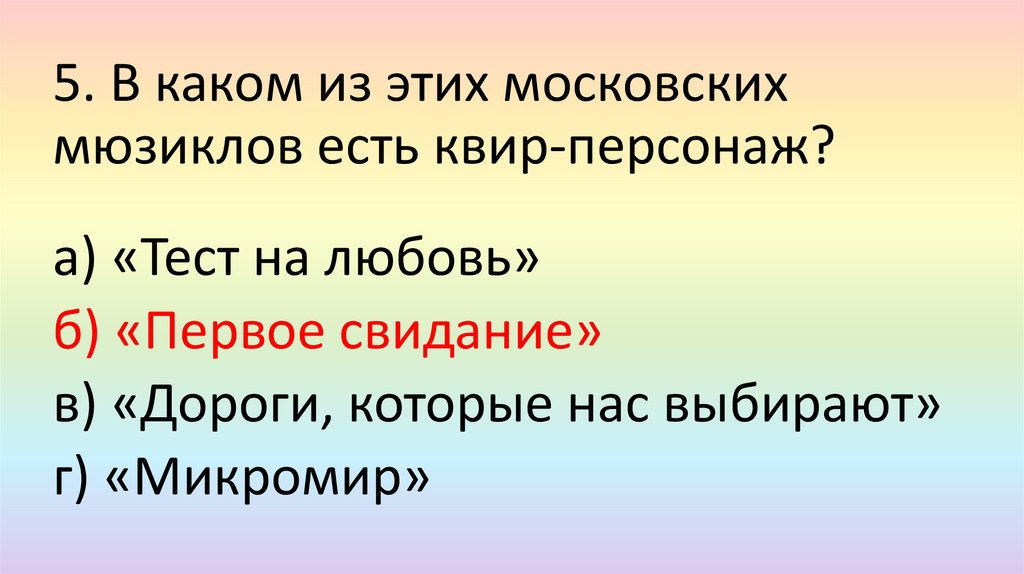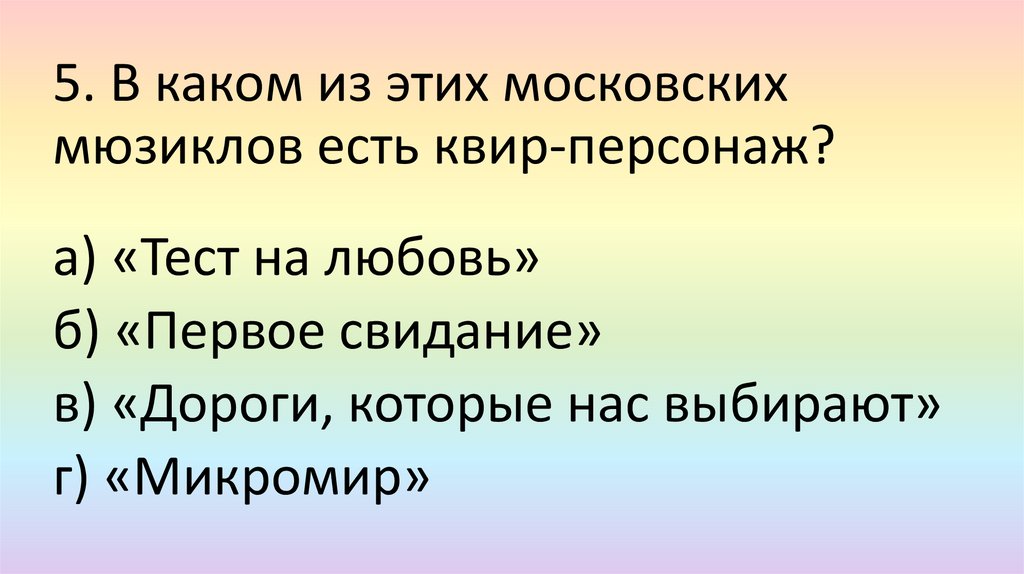 5. В каком из этих московскихмюзиклов есть квир-персонаж?