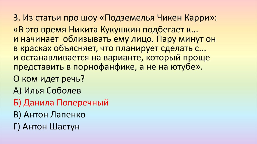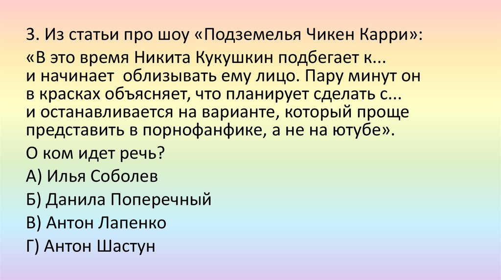 3. Из статьи про шоу «Подземелья Чикен Карри»:«В это время Никита Кукушкин подбегает к...