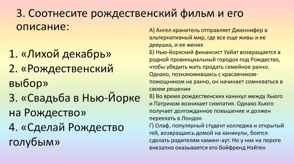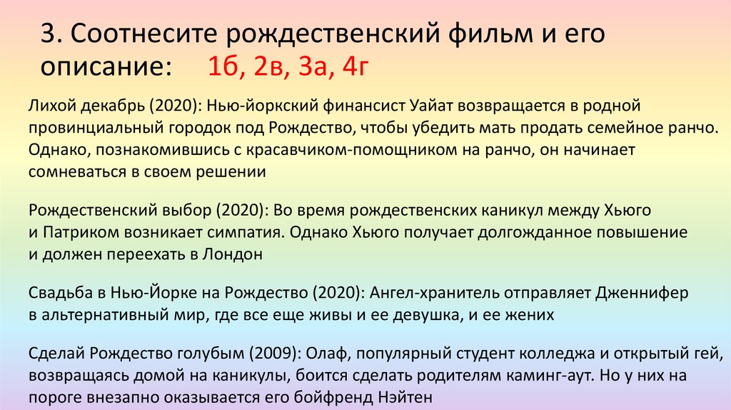 3. Соотнесите рождественский фильм и егоописание: 1б, 2в, 3а, 4г