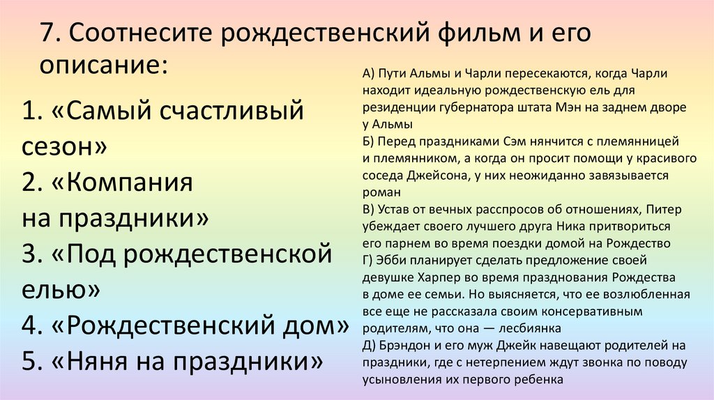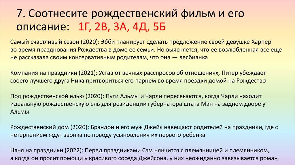 7. Соотнесите рождественский фильм и егоописание: 1Г, 2В, 3А, 4Д, 5Б