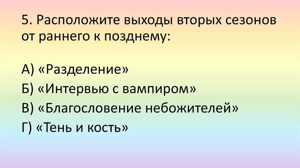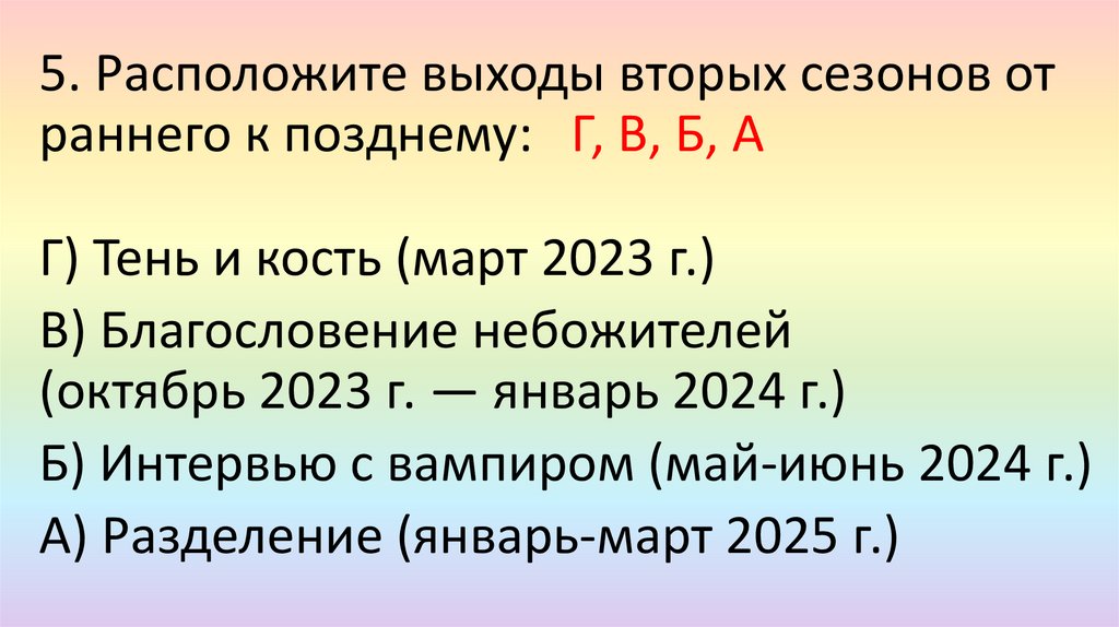 5. Расположите выходы вторых сезонов отраннего к позднему: Г, В, Б, А