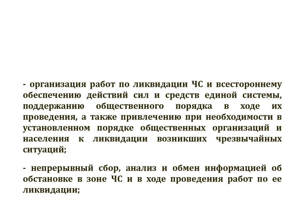 - организация работ по ликвидации ЧС и всестороннемуобеспечению действий сил и средств единой системы,