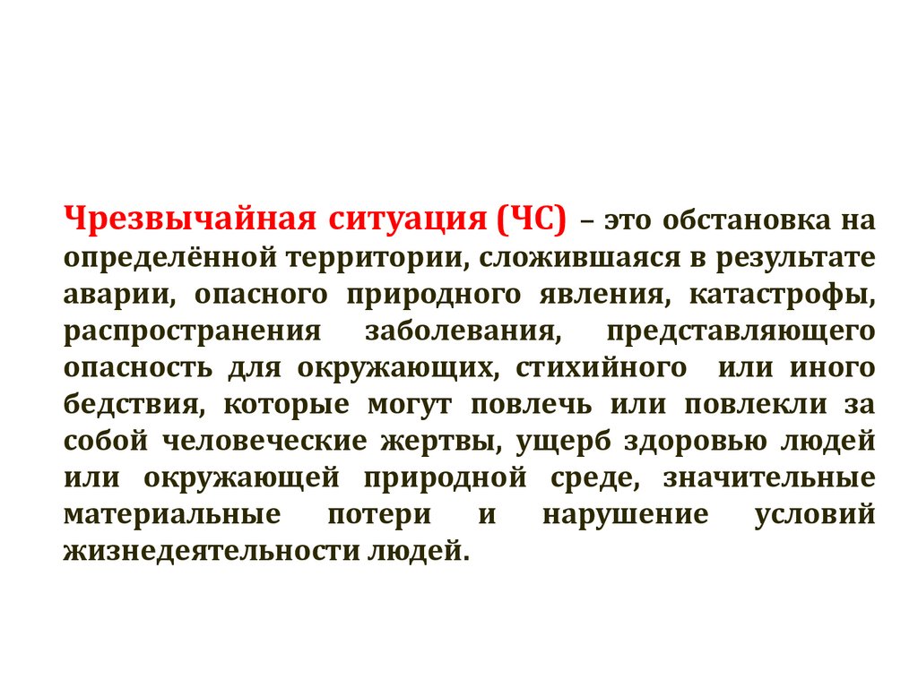 Чрезвычайная ситуация (ЧС) – это обстановка наопределённой территории, сложившаяся в результате