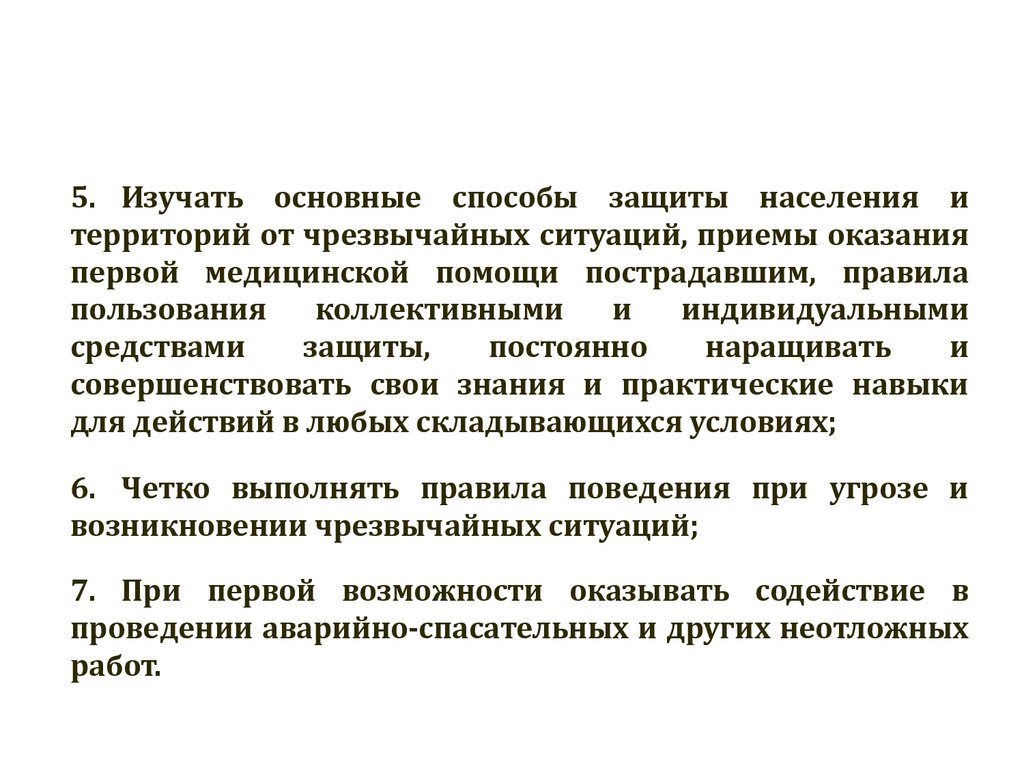 5. Изучать основные способы защиты населения итерриторий от чрезвычайных ситуаций, приемы оказания