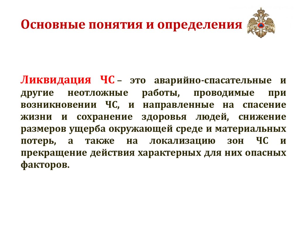 Основные понятия и определенияЛиквидация ЧС – это аварийно-спасательные и
