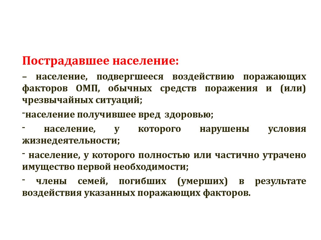 Пострадавшее население:– население, подвергшееся воздействию поражающих