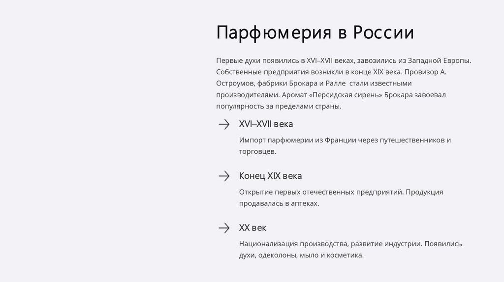 Парфюм ерия в РоссииПервые духи появились в XVI–XVII веках, завозились из Западной Европы.