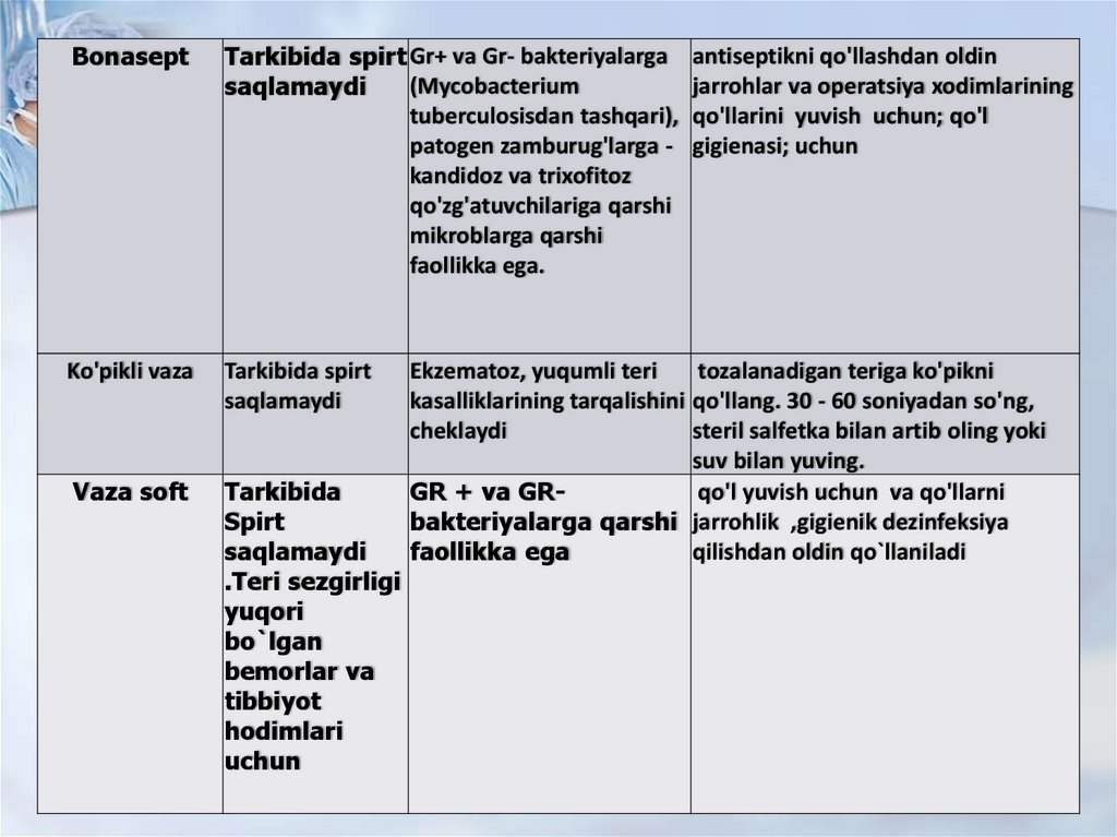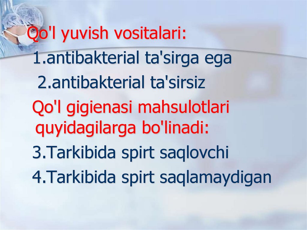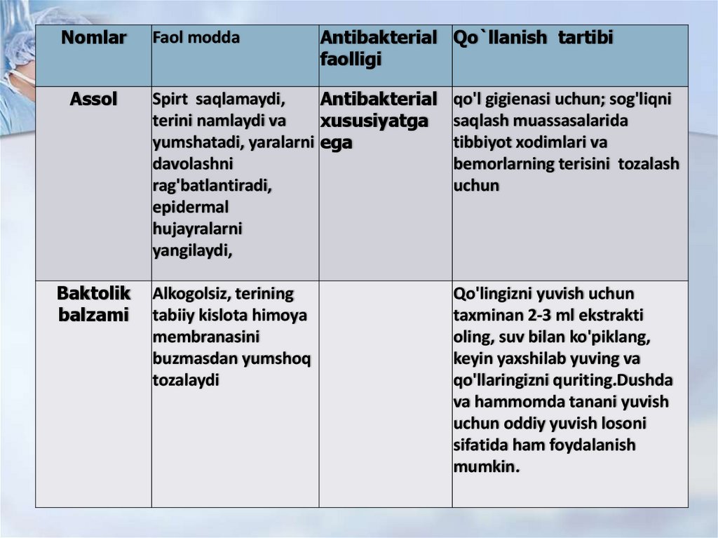 Qo'l yuvish vositalari:1.antibakterial ta'sirga ega