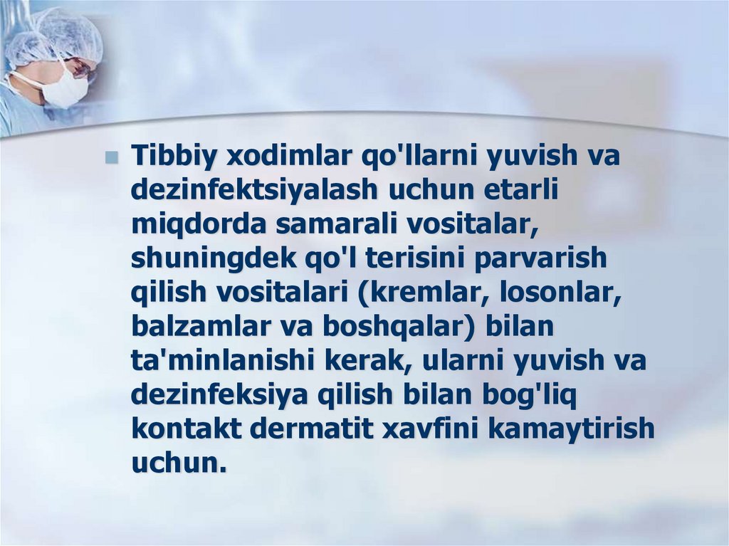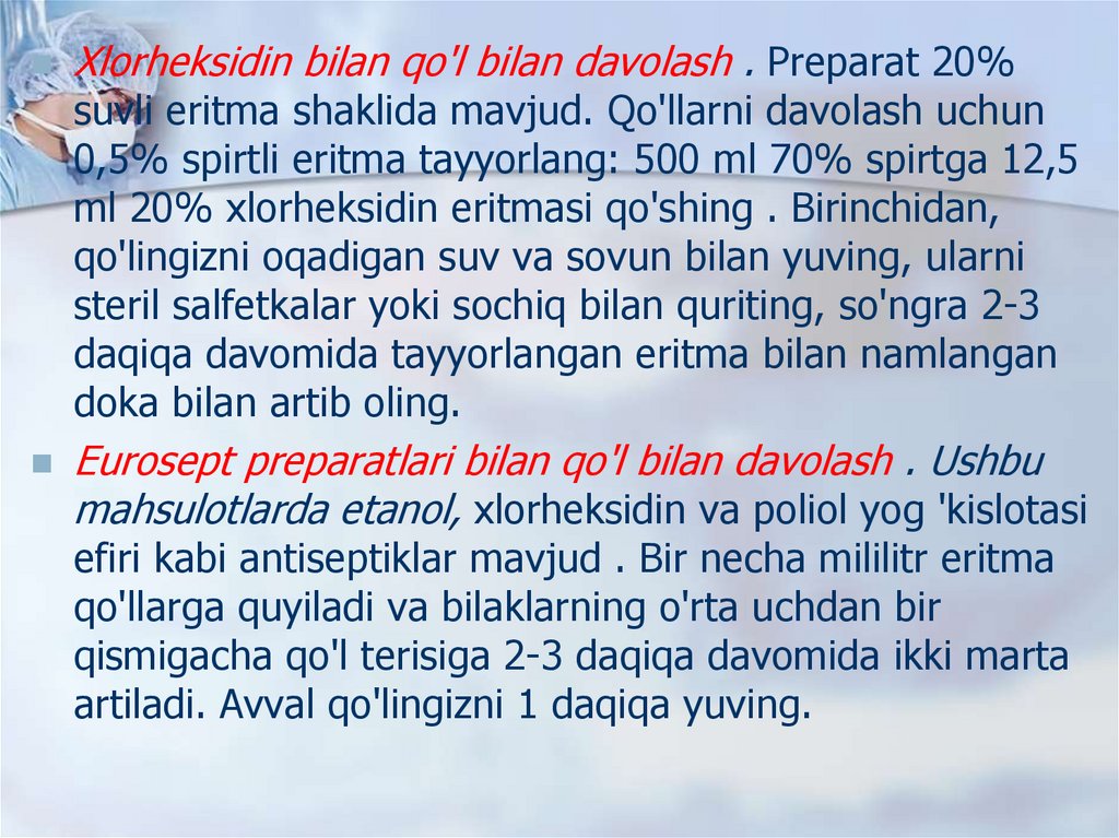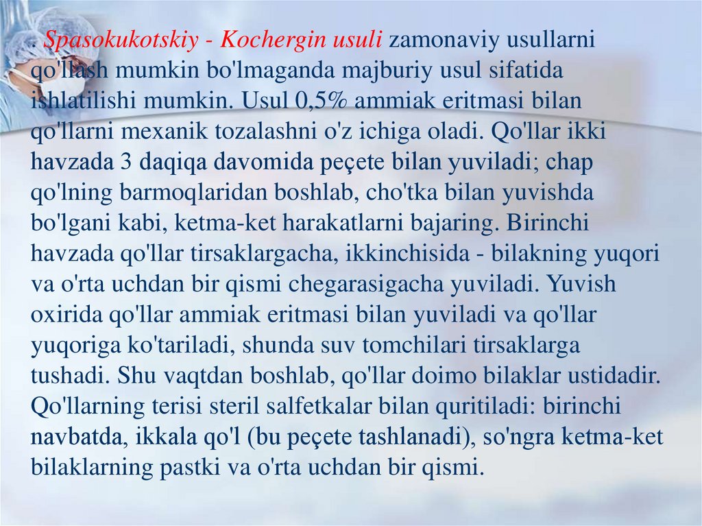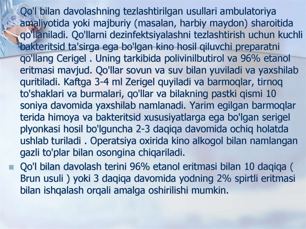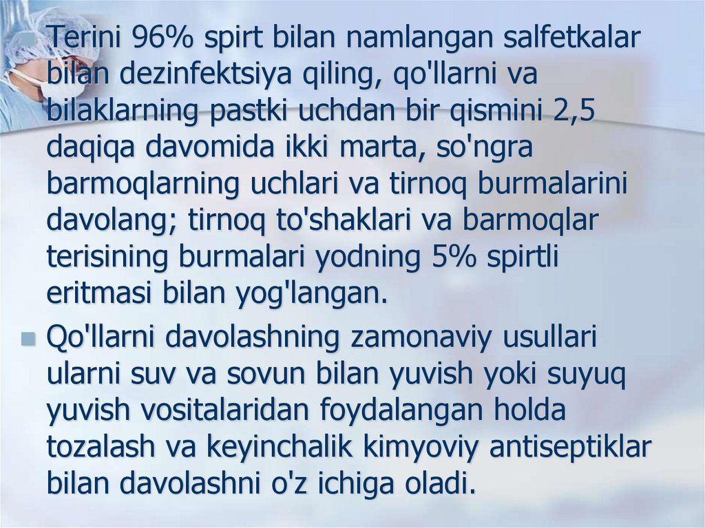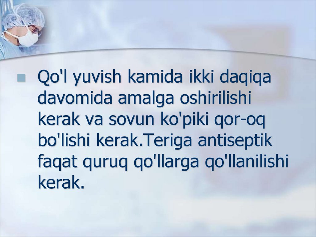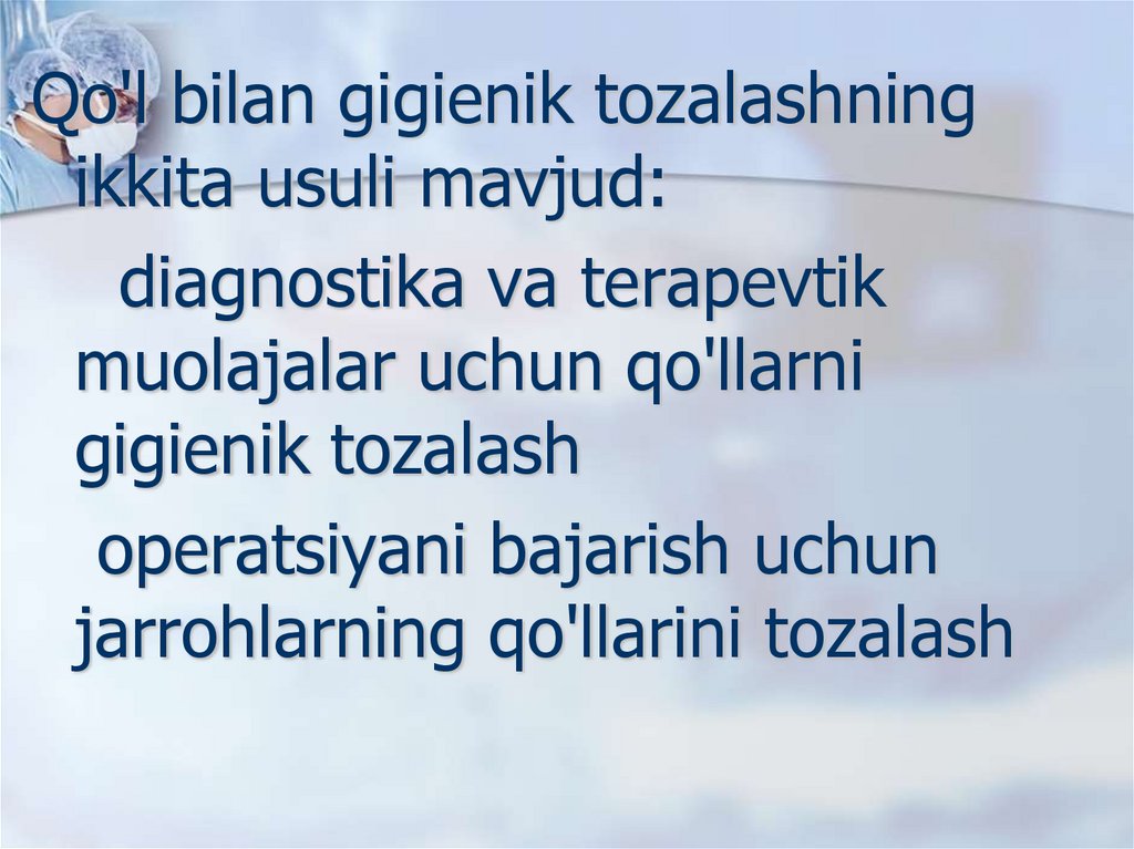 5. Qo'llarni tozalanishning gigienik darajasi ikkita usulni o'z ichiga oladi: