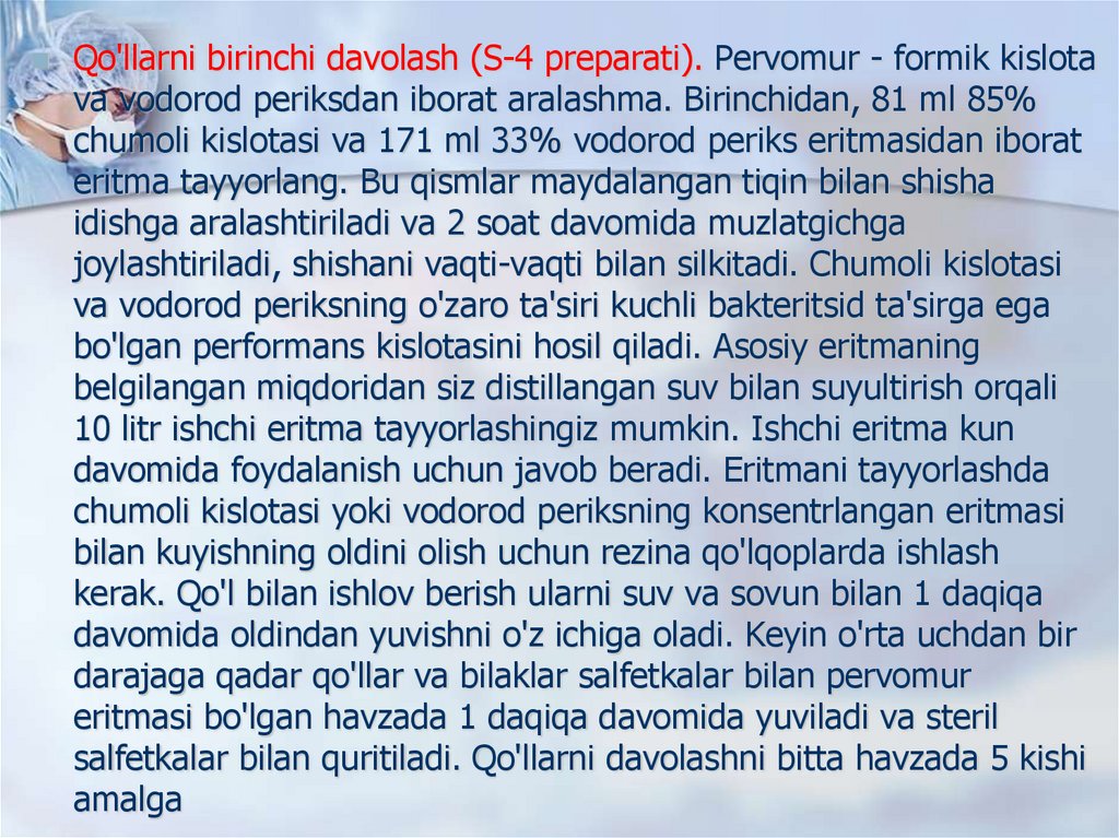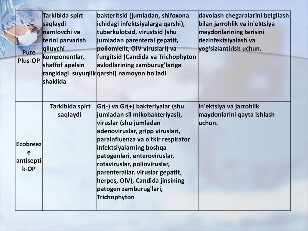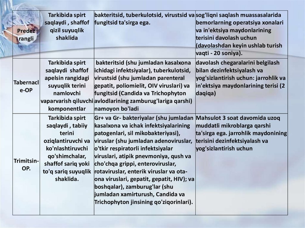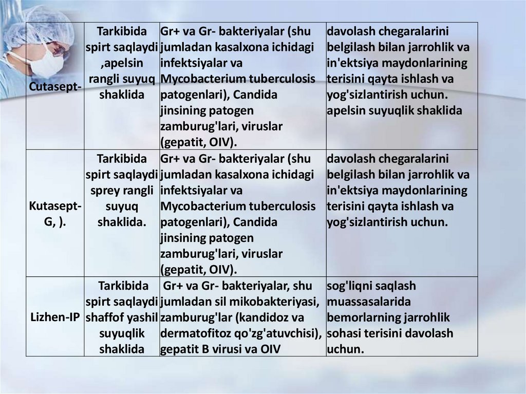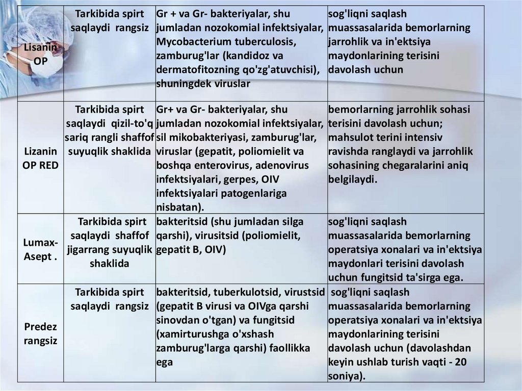 Tarkibida spirt bakteritsid, tuberkulotsid, virustsid va sog'liqni saqlash muassasalarida