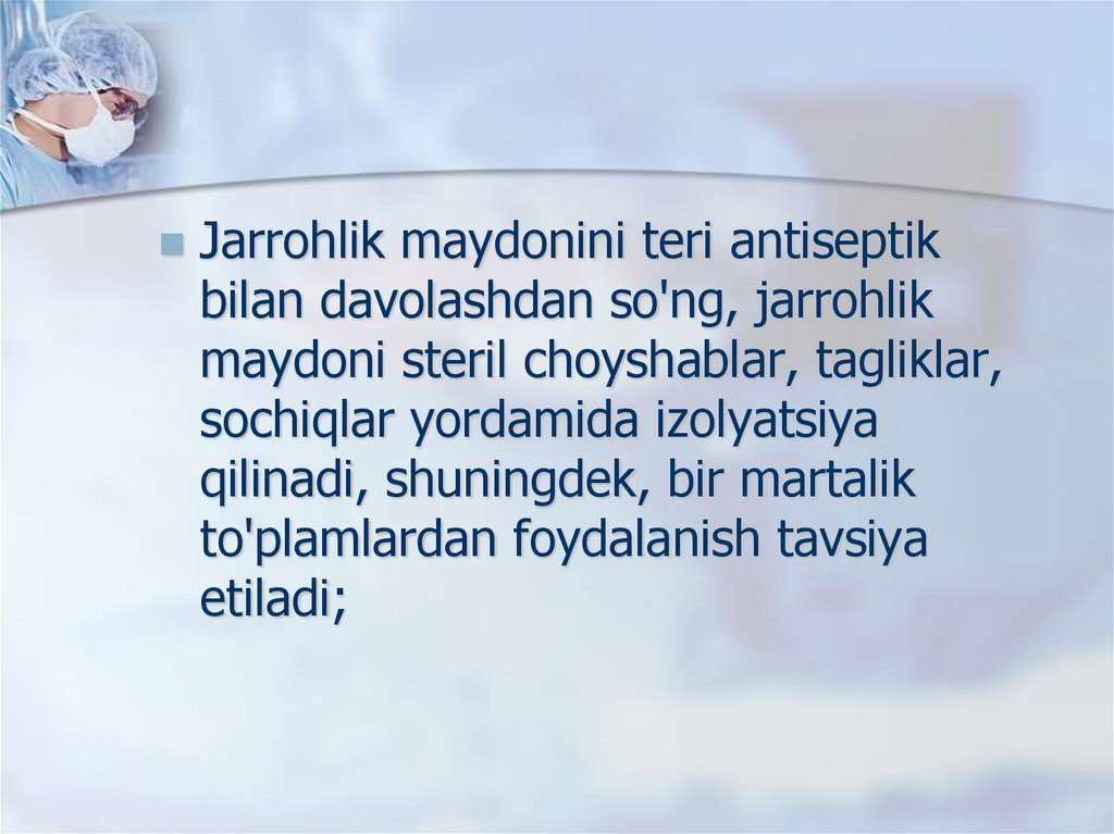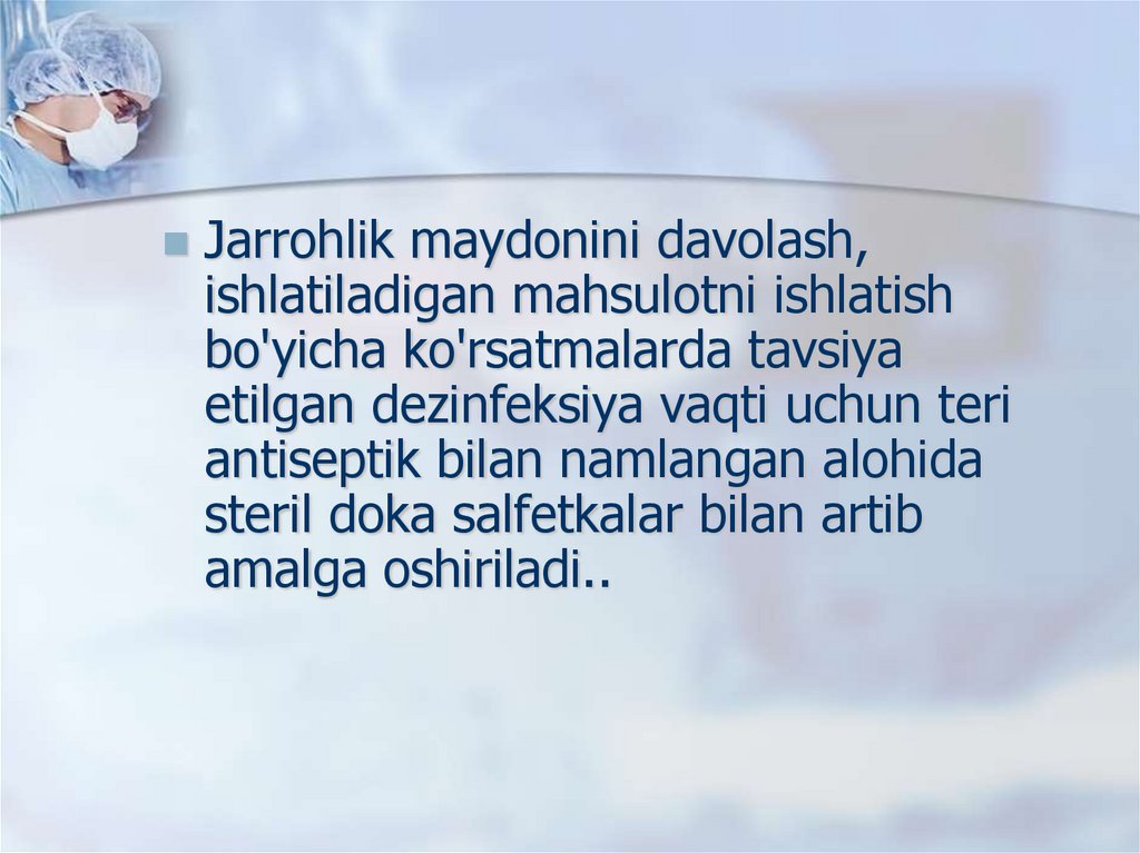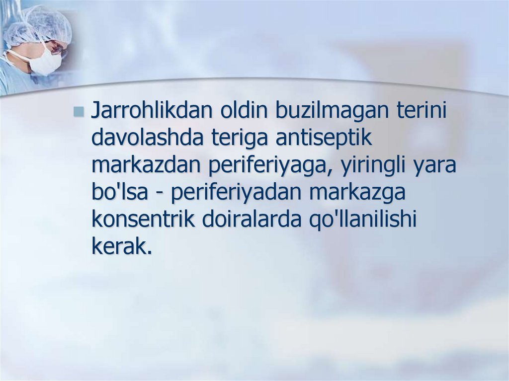 markazga konsentrik doiralarda qo'llanilishi kerak.56. Jarrohlik maydonini teri antiseptik bilan davolashdan so'ng, jarrohlik maydoni steril choyshablar, tagliklar, sochiqlar