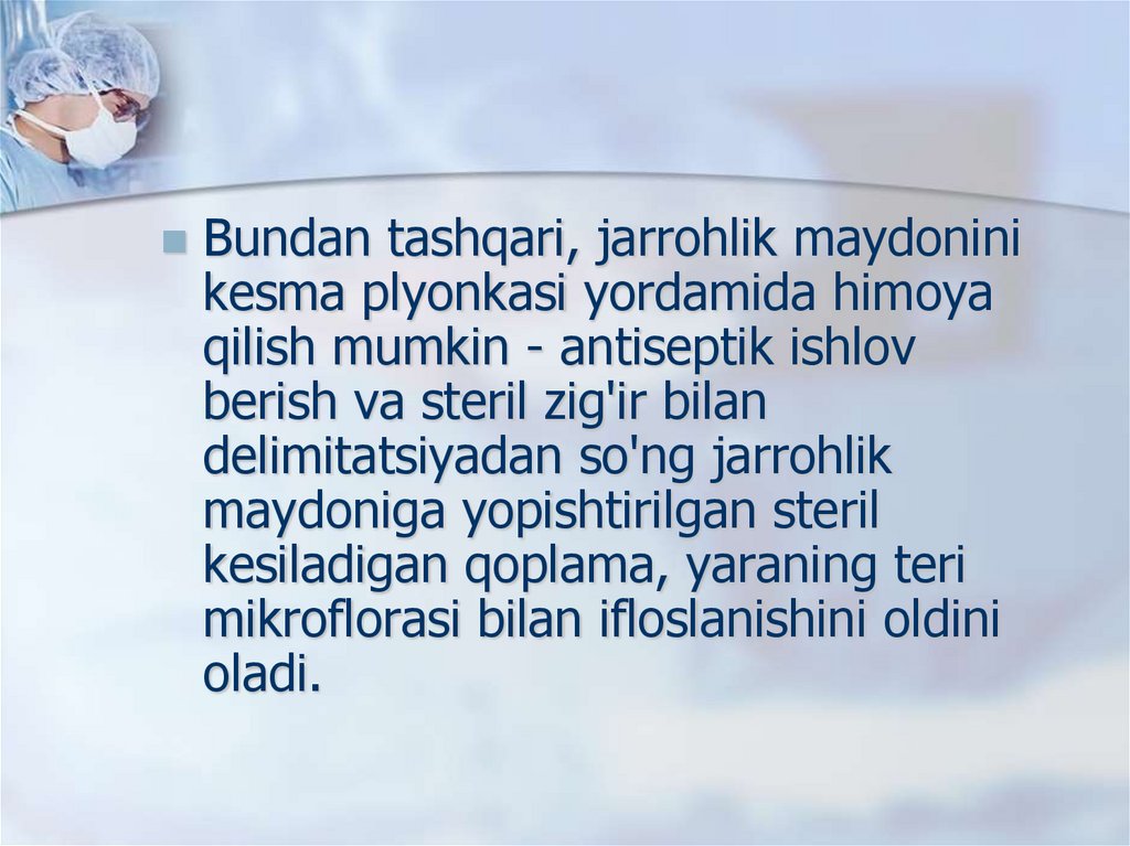 Bundan tashqari, jarrohlik maydoninikesma plyonkasi yordamida himoya