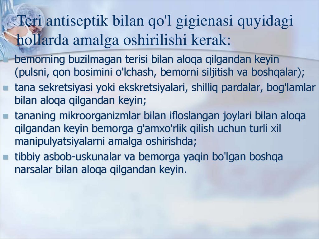Teri antiseptik bilan qo'l gigienasi quyidagihollarda amalga oshirilishi kerak: